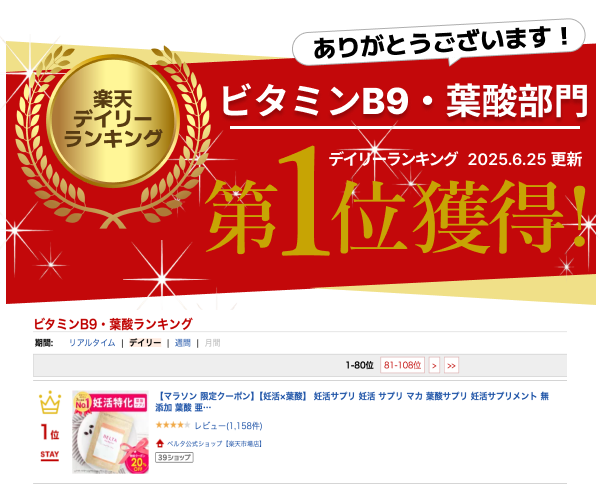 ※楽天デイリーランキング ビタミンB9・葉酸部門 2025年6月25日更新 (集計日:6月24日)